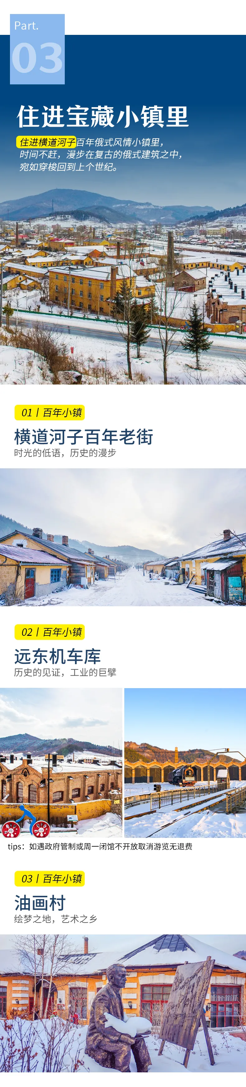 16:00 抵达【横道河子镇】,这里是中东铁路的必经之地,也是当年最为重要的交通枢纽之一,相比雪乡等地,这里还算小众;抵达时可能已经临近夜晚,我们安排好住宿后自由活动,明日再来逛逛这个小镇。