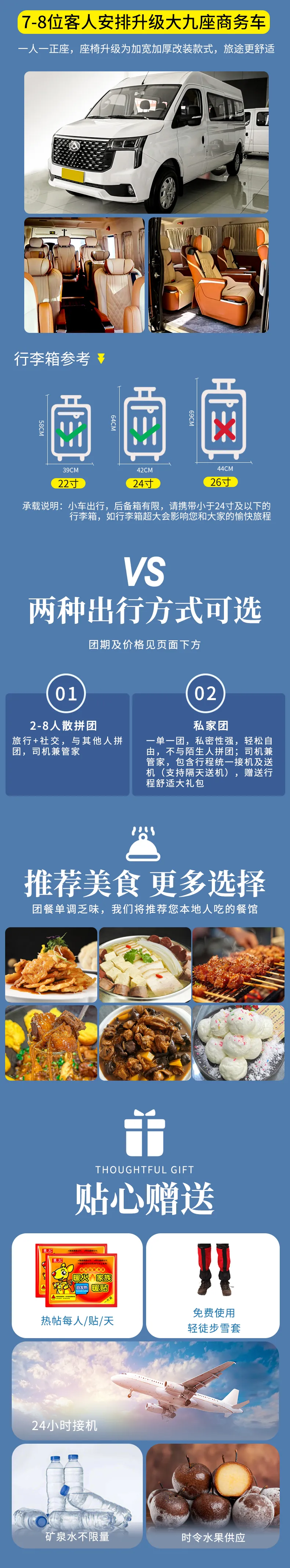 3、用车:2-3客人用5座SUV,4-5客人用7座商务车,6客人用9座商务车,7-8客人用大九座商务车,保证旅途舒适舒心。(小团副驾驶及前后座位置需要轮流乘坐,望悉知)