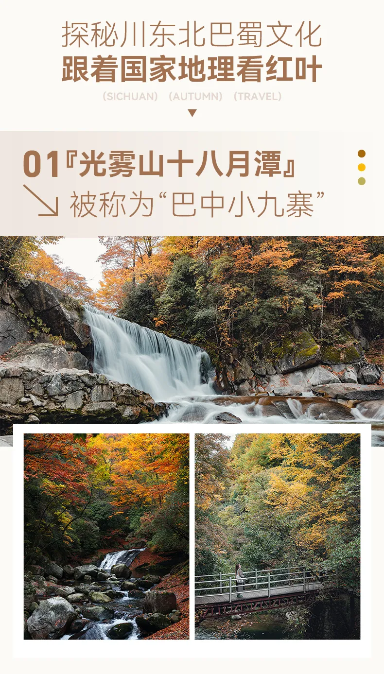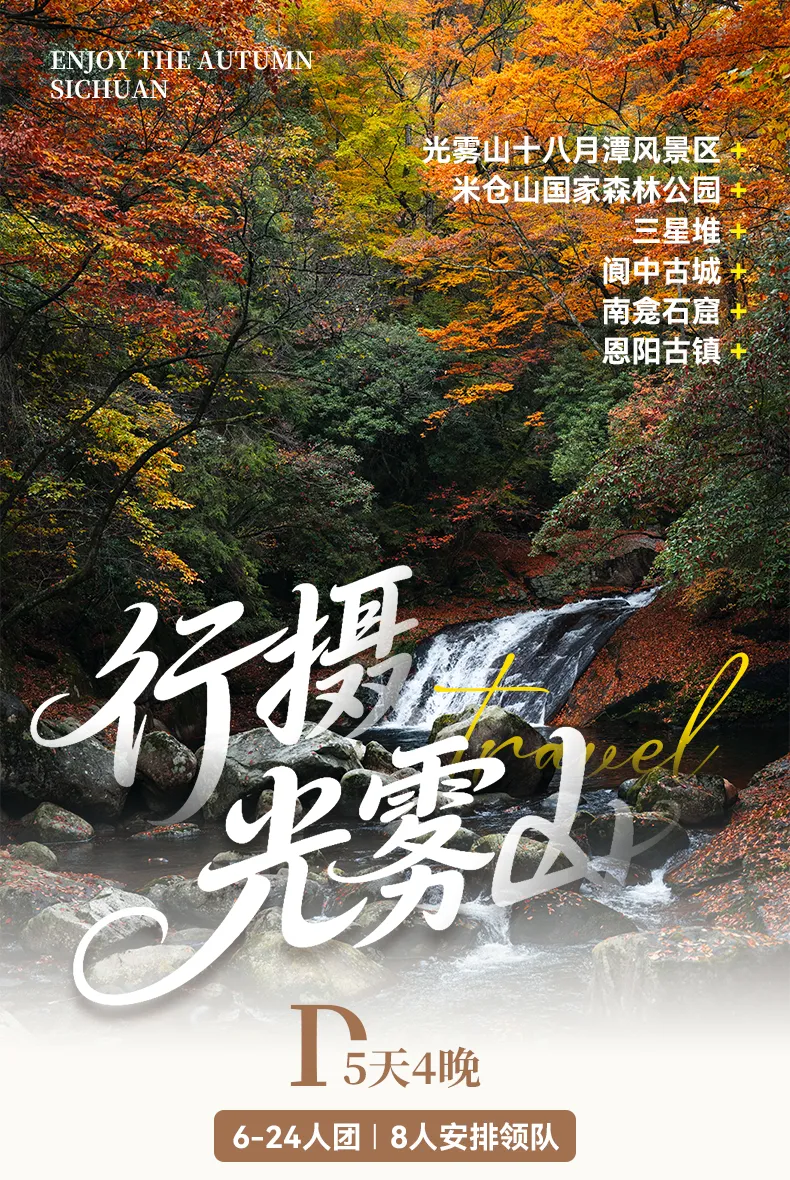 上午:早餐后从阆中出发,前往光雾山【十八月潭景区】,长约3.5公里的珍珠沟内密布着18处瀑潭,红叶为幕布,十八月潭看水,感水之灵性。该景区主要有九角山、玉印台、十八月潭十九瀑等精品景点。大家可以自行游玩也可以跟随领队游玩。