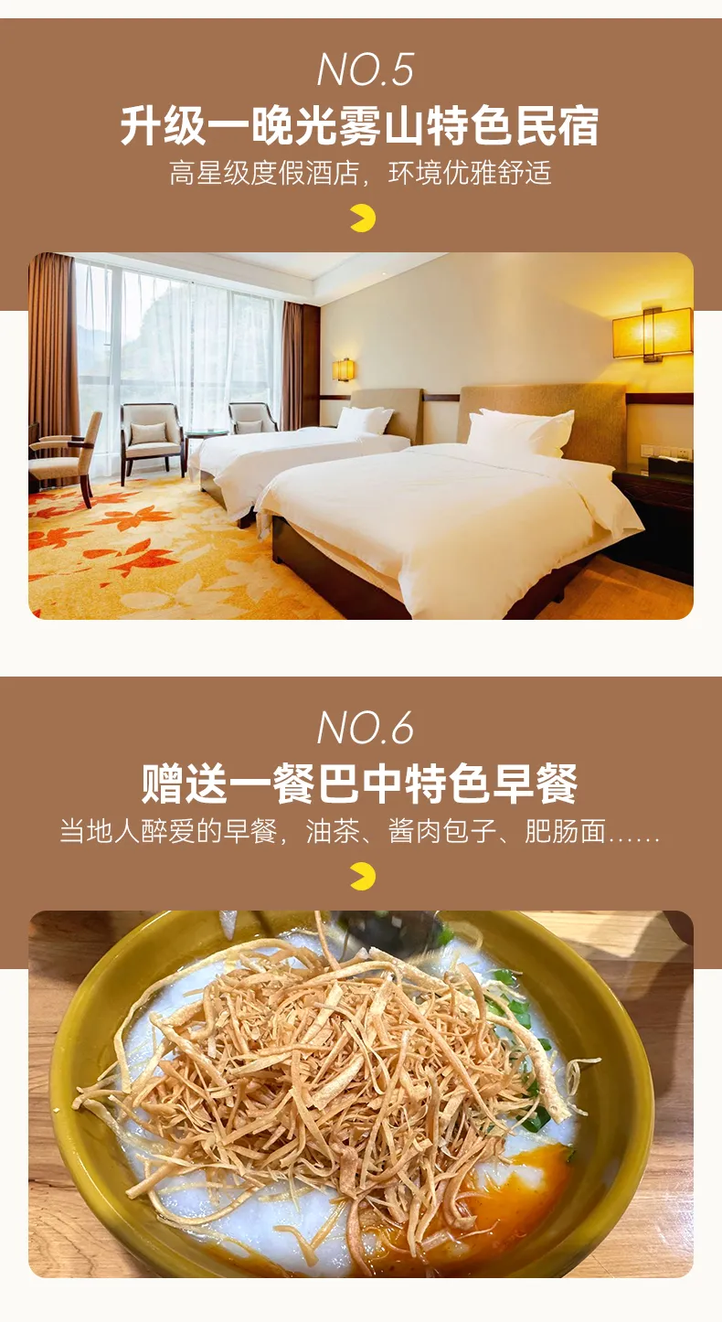 1晚阆中古城四钻酒店②1晚光雾山特色民宿③1晚巴中市四钻酒店