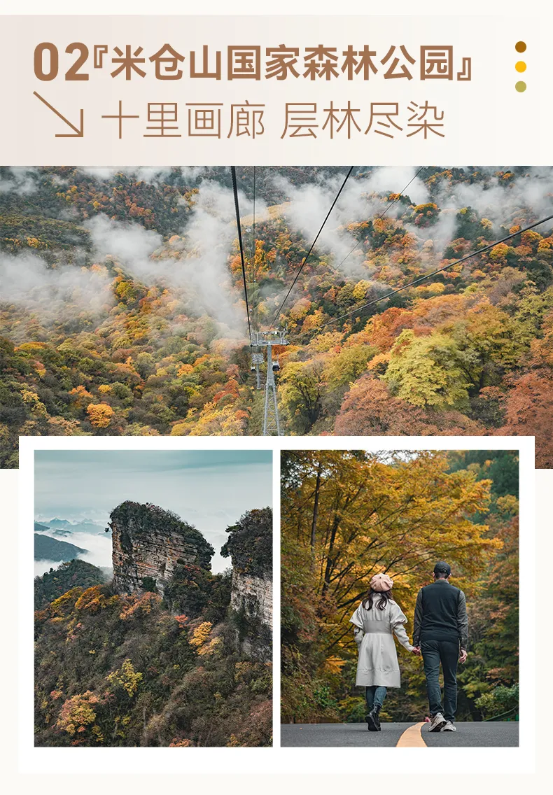 上午:早餐后从从镇上出发,约15分钟便可抵达【米仓山国家森林公园(大坝景区)】,从景区大门乘坐观光车(60元/人)到达天然画廊停车点,车程约30分钟,沿途可欣赏漫山红叶。到达天然画廊正式开启赏秋之旅,你可以直接乘坐香炉山索道(单程80元/人,往返150元/人),直奔山顶,高处俯瞰整个光雾山的美景,运气好可以看到云海;下索道后打卡金色长廊,这里拍照十分出片,后坐观光车依次游览黑熊沟、大小兰沟,一路边走边玩边拍照。