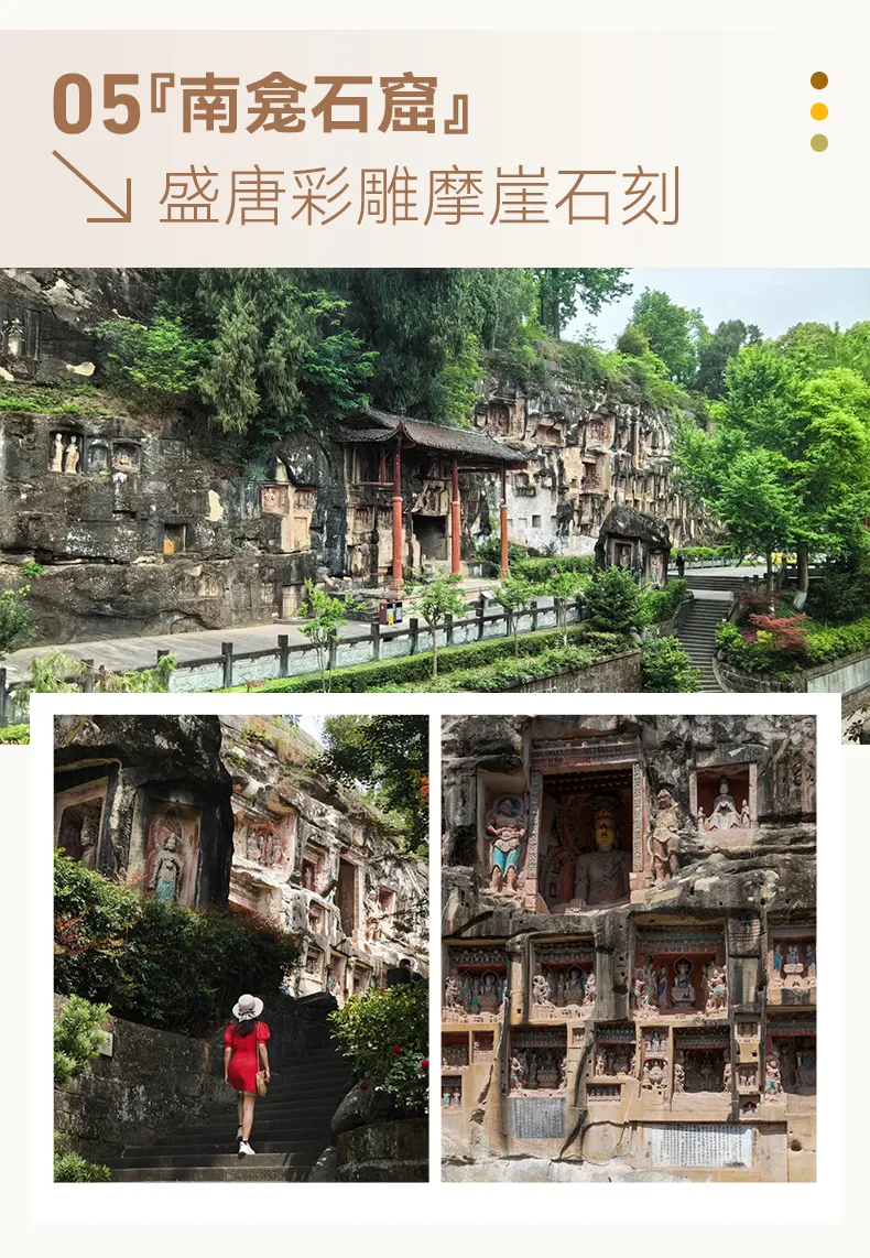 上午:早餐给大家安排巴中本地人力荐的特色早餐,餐后前往南龛石窟,车程20分钟左右,这里汇聚了无数精美的佛像和壁画。可以依次打卡南龛石窟、将帅碑林、飞霞阁、北龛石窟、西龛石窟、东龛石窟。在飞霞阁您可以俯瞰整个南龛石窟的美景,拍照非常出片。