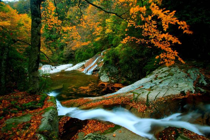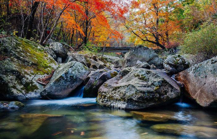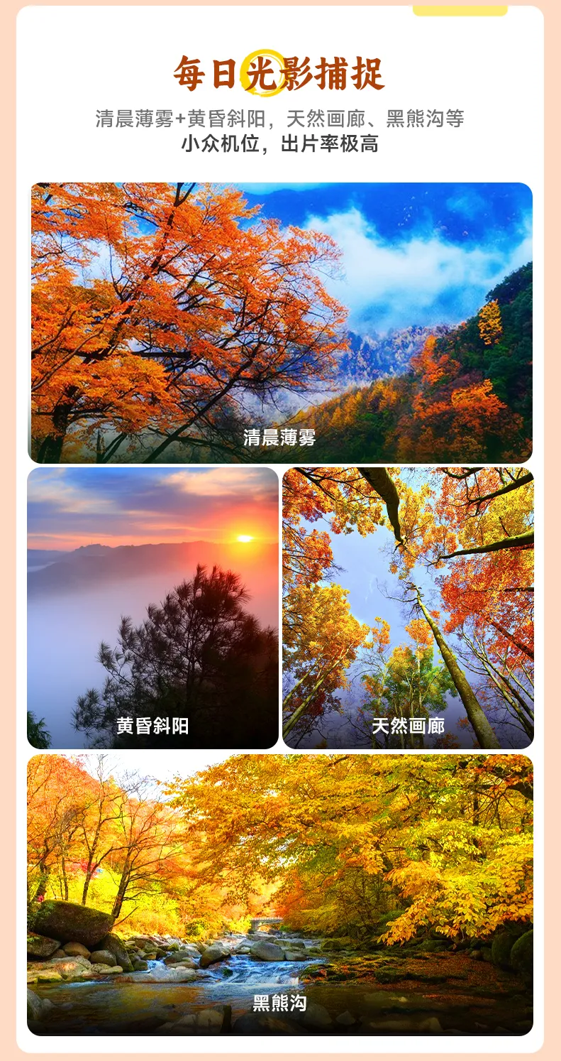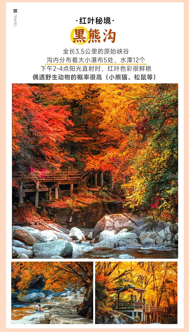 紧接着我们便深入被誉为“精华所在”的【黑熊沟】。将踩着松软深厚的落叶“地毯”探秘峡谷,看瀑布从锈红色的岩壁上跌落成潭,偶有松鼠在挂满红叶的枝头跳跃,充满野趣。