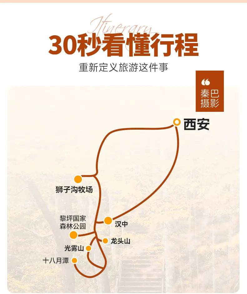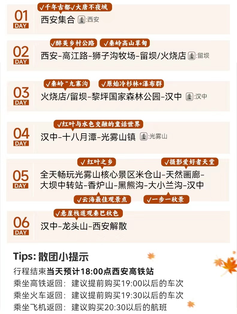 游玩结束后,中午便启程穿越秦岭返回【西安】,车窗外的山峦从斑斓秋色渐变为关中平原的辽阔景象。约18:00抵达西安指定解散点(高铁站),结束这场贯穿秦巴秘境的六日秋色盛宴。散团后大家可以自由活动。欢乐的时光总是短暂的,也期待我们下一次的相遇。