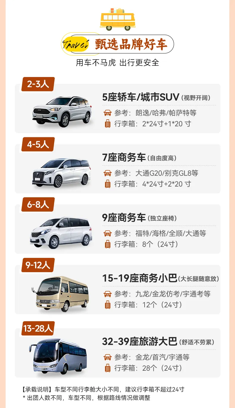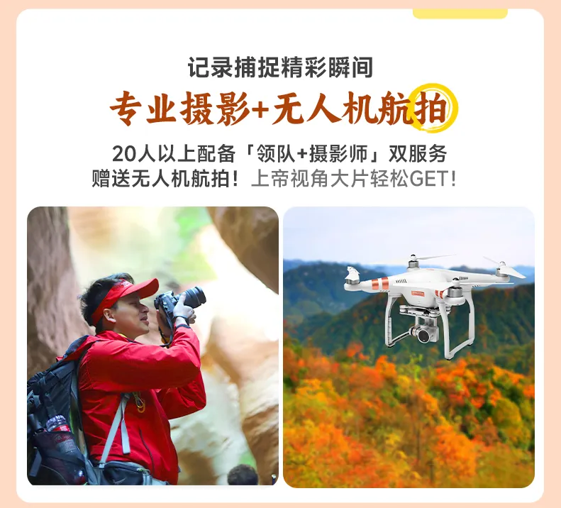 5、领队:28人品质团:8人以上(不含8人)安排1名领队,20人及以上(含20人)安排1名摄影领队+无人机航拍。