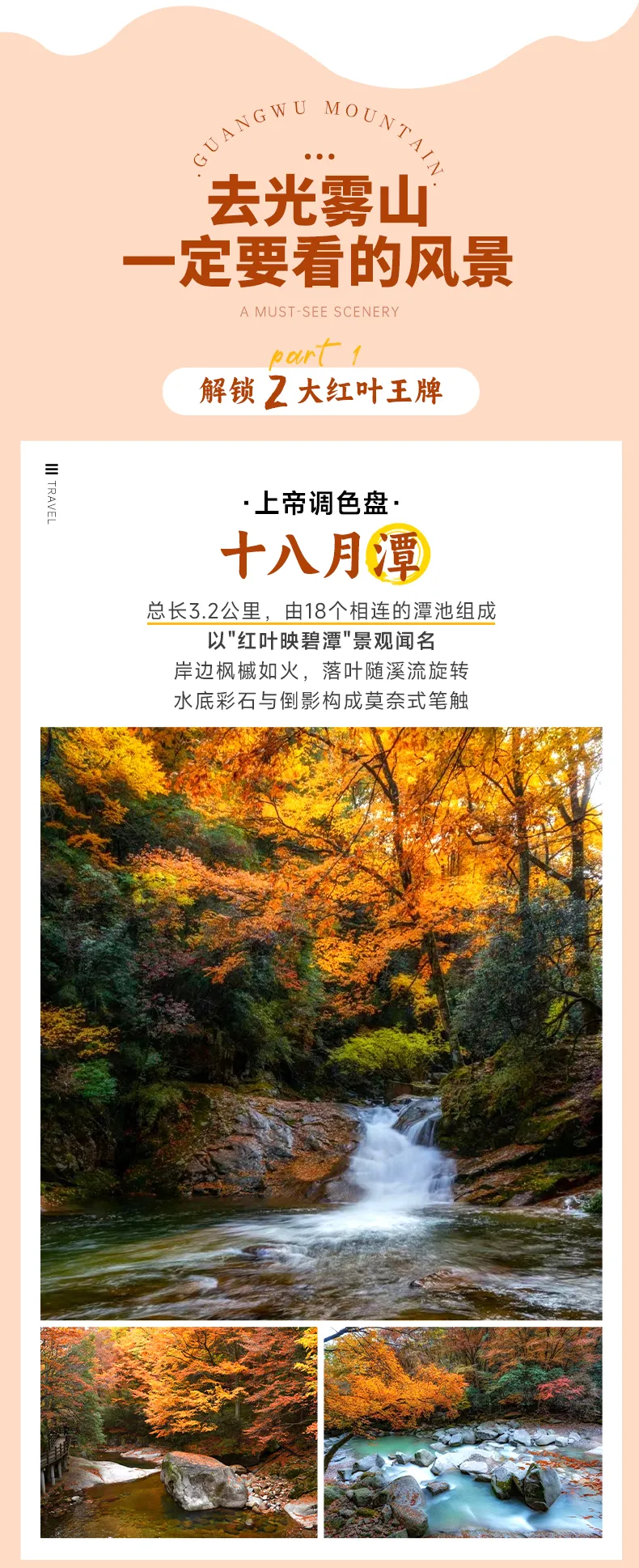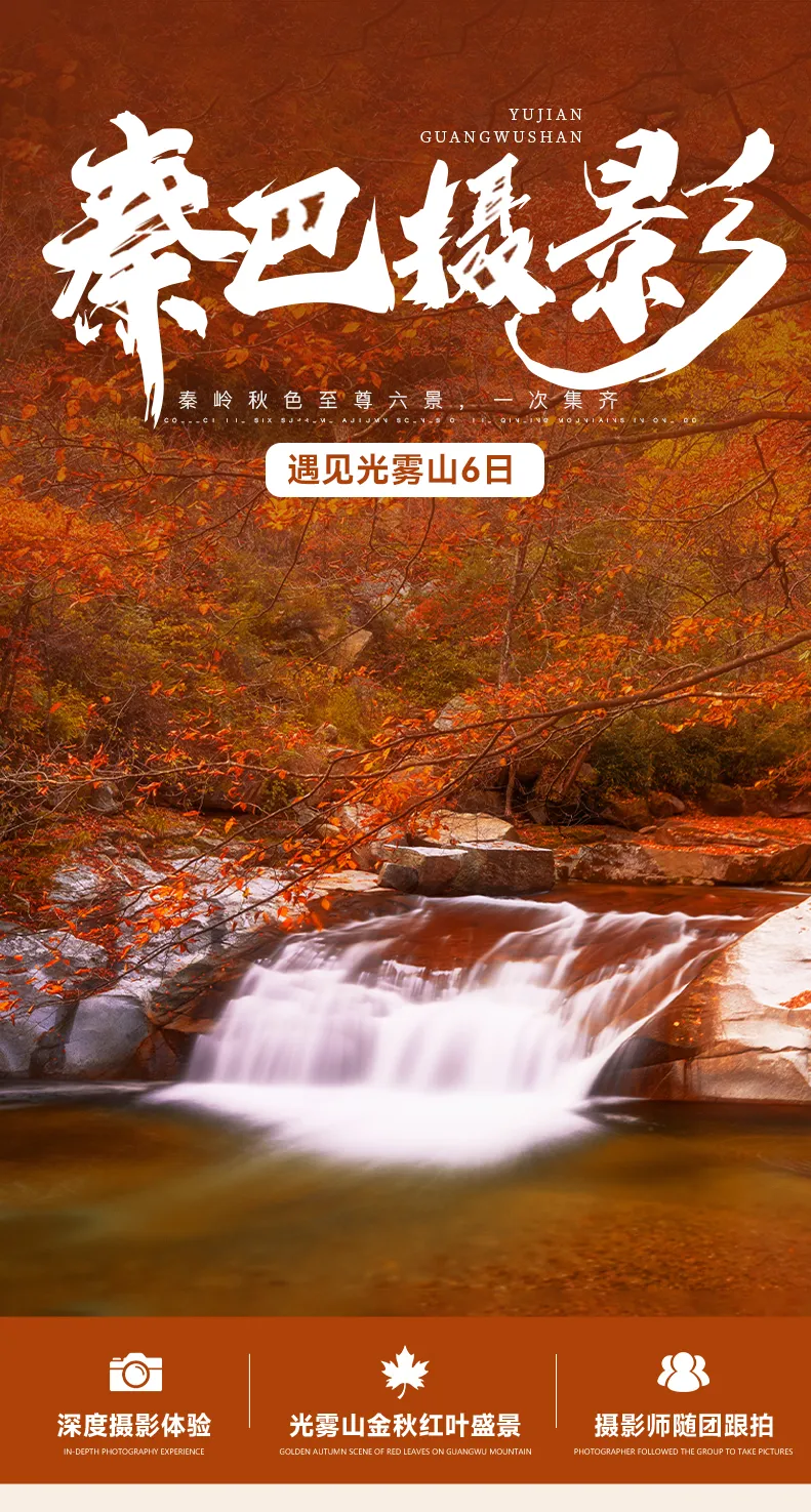 早餐后,我们从汉中出发,沿着蜿蜒的盘山公路深入【米仓山腹地】,抵达被誉为"红叶水韵童话世界"的【十八月潭】(行程距离:150km行车时间:3小时)。这条3.2公里长的秘境,由18个翡翠般的潭池串联而成,十月底的红叶如火如荼,金黄的银杏、橙红的枫树与碧绿的潭水交相辉映,落叶随溪流旋转起舞,木栈道上每一步都沙沙作响。乘车至光雾山密林深处,到达素有“月潭赛九寨,红叶天下绝”之美誉的【十八月潭】,长约3.5公里的珍珠沟内密布着18处形似月牙的瀑潭,溪水从布满红叶的山间流过,红叶随溪水漂流不时打着回旋,与漫山彩林勾勒出如画般醉人秋景。思月潭、净月潭、仙女潭、孔雀潭......眼里是盛不完的景,镜头有捉不住的秋。要说ZUI具特色的一潭,莫过于这高约50米的【婚纱瀑布】,远远望去仿佛洁白头纱,纯净无暇。大家可以利用慢门捕捉到这一绝美风光。