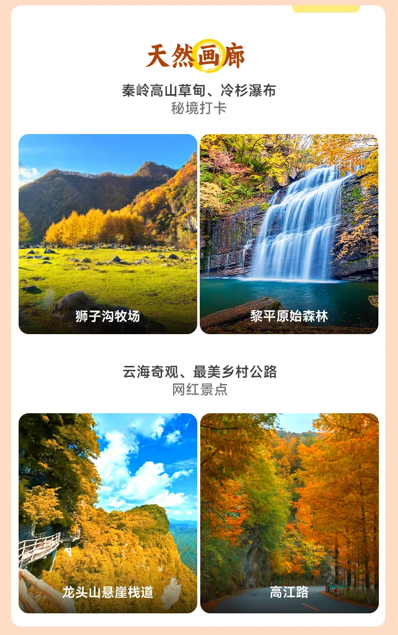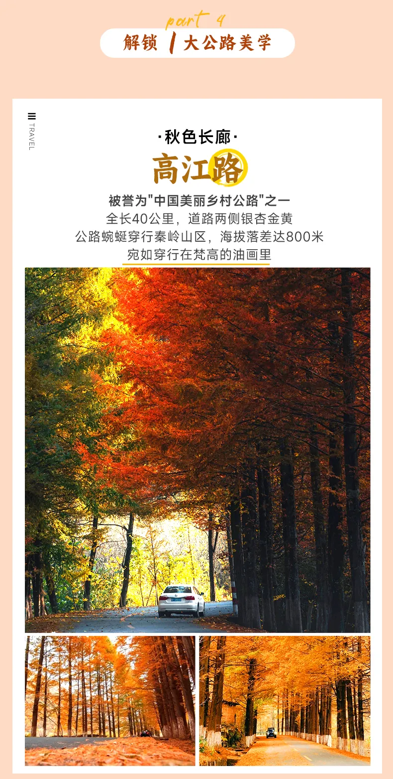 今天,愉快的旅途正式启程!吃完早餐,我们从西安出发,迎着初秋的晨光沿西汉高速驶向秦岭深处。穿越18公里长的终南山隧道后,山色渐染秋意,后抵达【高江路】(行程距离:260km行车时间:3小时30分钟)——这条40公里长的"中国最美乡村公路"在十月披上金色盛装,银杏夹道,车轮碾过落叶沙沙作响,沿途石门子观景台可俯瞰蜿蜒公路与层林尽染的山谷。