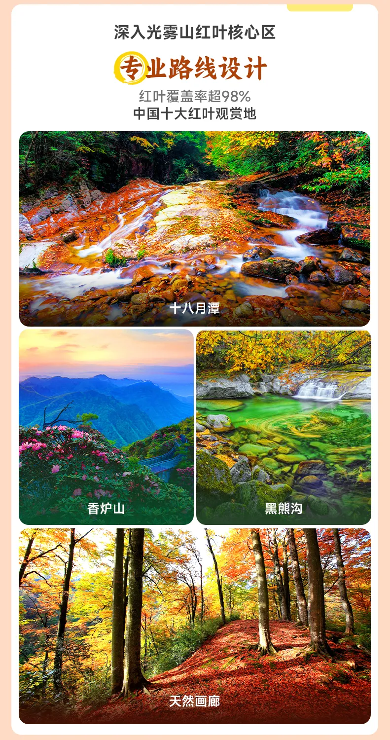 吃完早餐后从光雾山镇出发,今天我们全天畅玩光雾山核心景区米仓山(行程距离:20km 行车时间:30分钟)!抵达景区后,我们的第一站便是【天然画廊】,这里的秋色浓缩而精致。漫步于3公里的原始森林栈道,两侧笔直的水青冈与火红的三角枫构成天然的油画长廊,阳光透过树冠洒下斑驳光影,宛如行走在艺术殿堂!