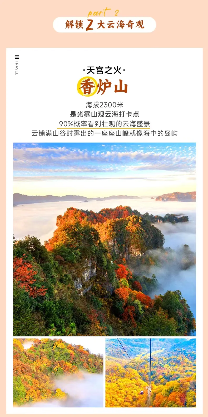 午后,先坐透明索道20 分钟直达海拔2330米的【香炉山】山顶。也可选择徒步挑战!抵达后立于山巅观景台,脚下云海奔涌,远处层林尽染,万亩彩林在秋阳下熠熠生辉,场面震撼如仙境,有胆量的朋友可以尝试再走 2300 米的玻璃栈道,惊险又刺激!
