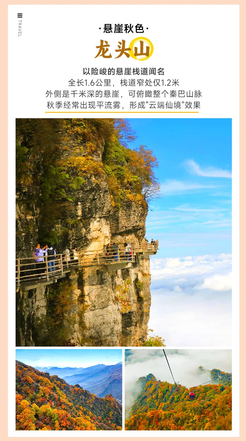早餐后,我们前往从汉中出发前往【龙头山】(行程距离:70km 行车时间:1小时30分钟),抵达后直接乘坐缆车+扶梯直达海拔2300米的龙头山巅。漫步3.6公里悬崖栈道,脚下是千米深渊蒸腾的云海,身旁是触手可及的彩林,玻璃观景台可拍摄“人在画中游”的震撼大片。