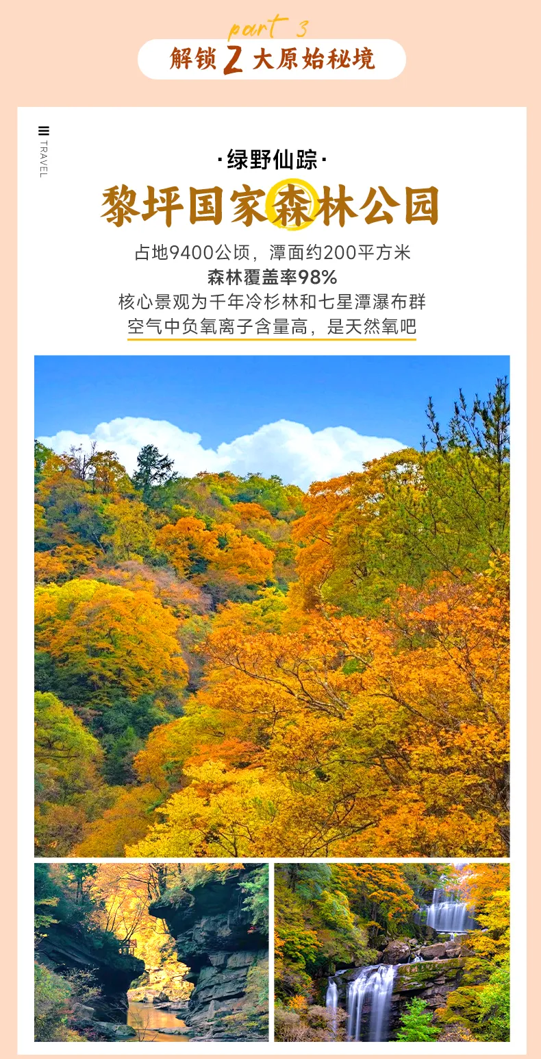 早餐后,我们从火烧店或留坝出发,穿越晨雾缭绕的秦岭山谷,抵达被誉为"北纬33°绿野仙踪"的【黎平国家森林公园】(行程距离:140km行车时间:3小时)。这座占地9400公顷的原始森林在秋日化身色彩秘境(游览3小时),漫步在铺满松针的生态步道,30米高的千年冷杉林间洒落斑驳阳光,七星潭瀑布群如银链般串联起七个翡翠色潭池,水声潺潺与鸟鸣相和。