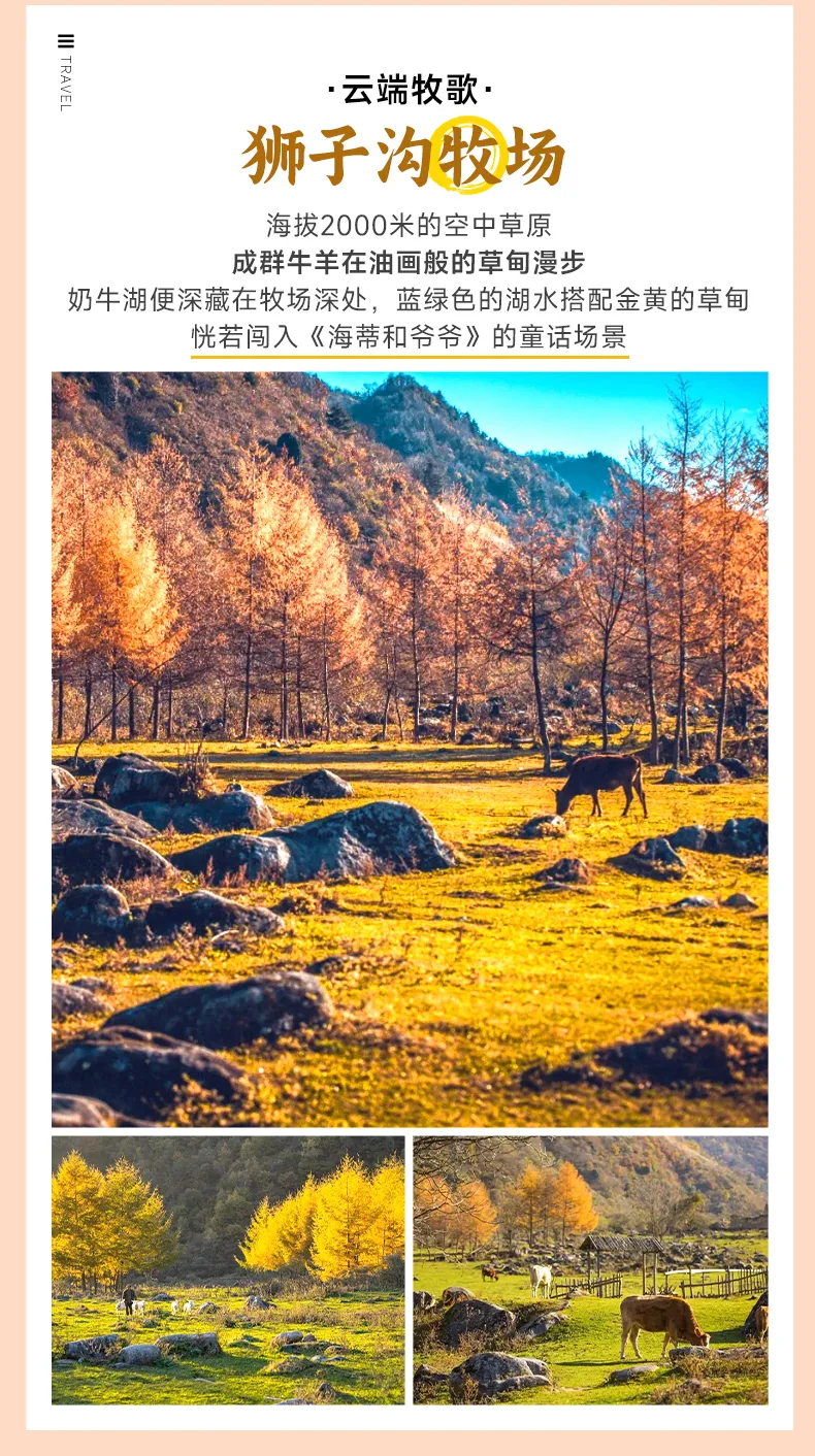 继续前行便抵达海拔2100米的【狮子沟牧场】(行程距离:25km行车时间:40分钟),金黄草甸上散落着古朴石墙与悠闲的牛羊群,步行15分钟即可到达秘境般的奶牛湖,湖水倒映着雪山与彩林。