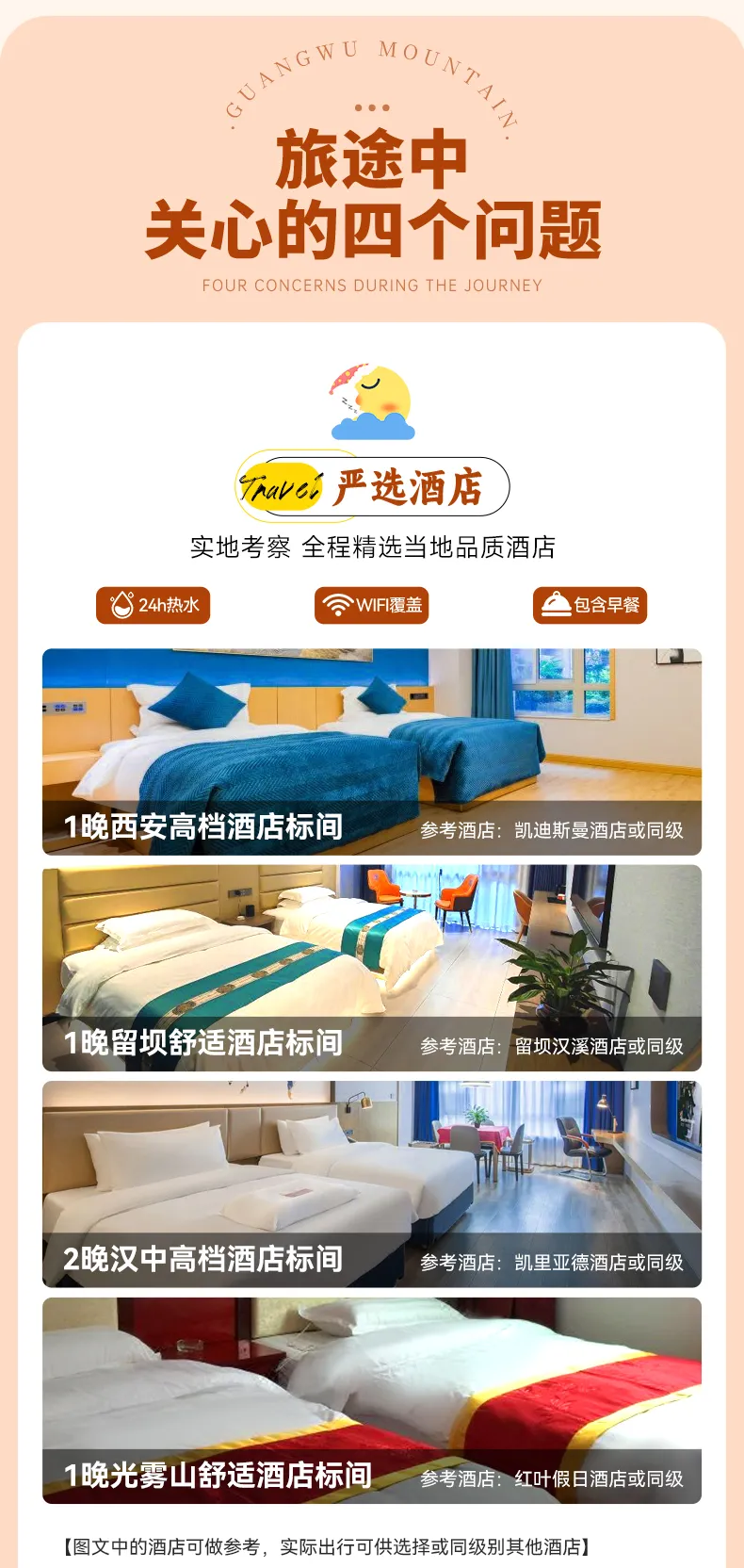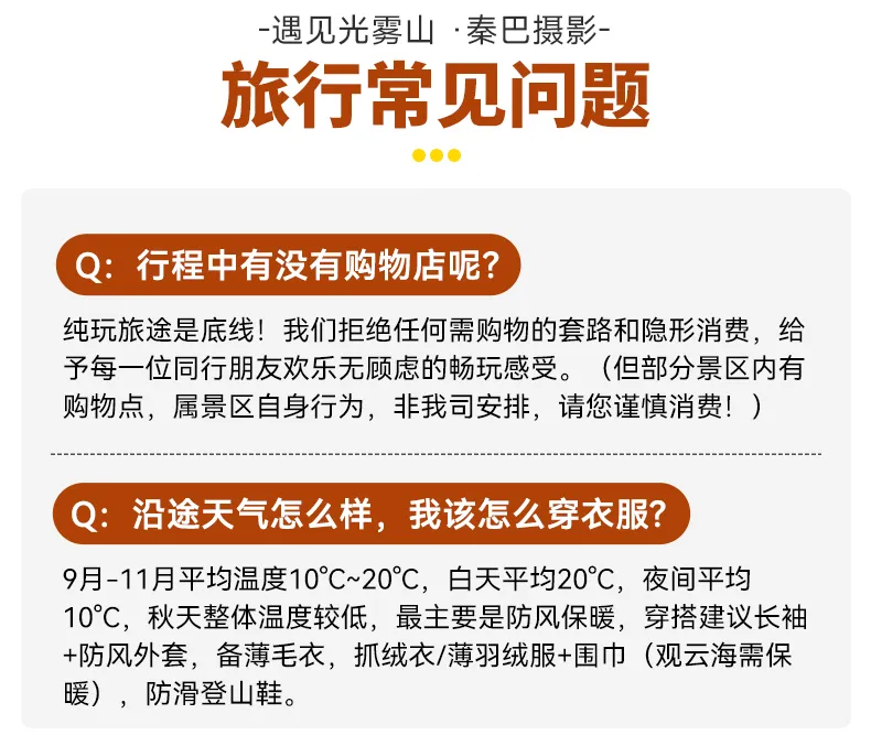 出发前三天短信通知集合酒店。到达酒店报【遇见光雾山+姓名】入住酒店。